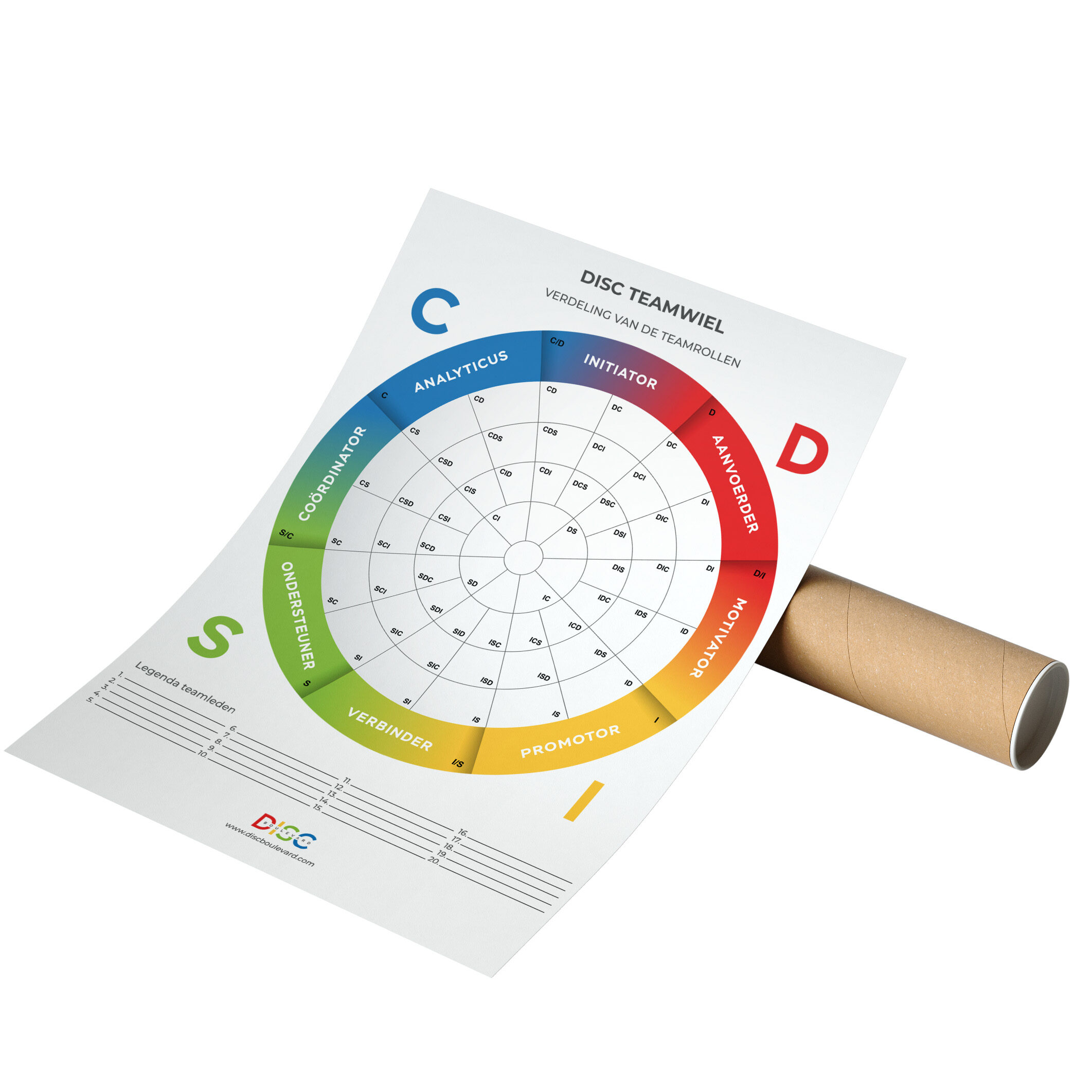 Beschrijfbare poster in A1 formaat. Geef elk teamlid een plekje in het teamwiel en krijg inzicht in de verdeling van de DISC teamrollen. Leuk om achter te laten na een teamsessie!