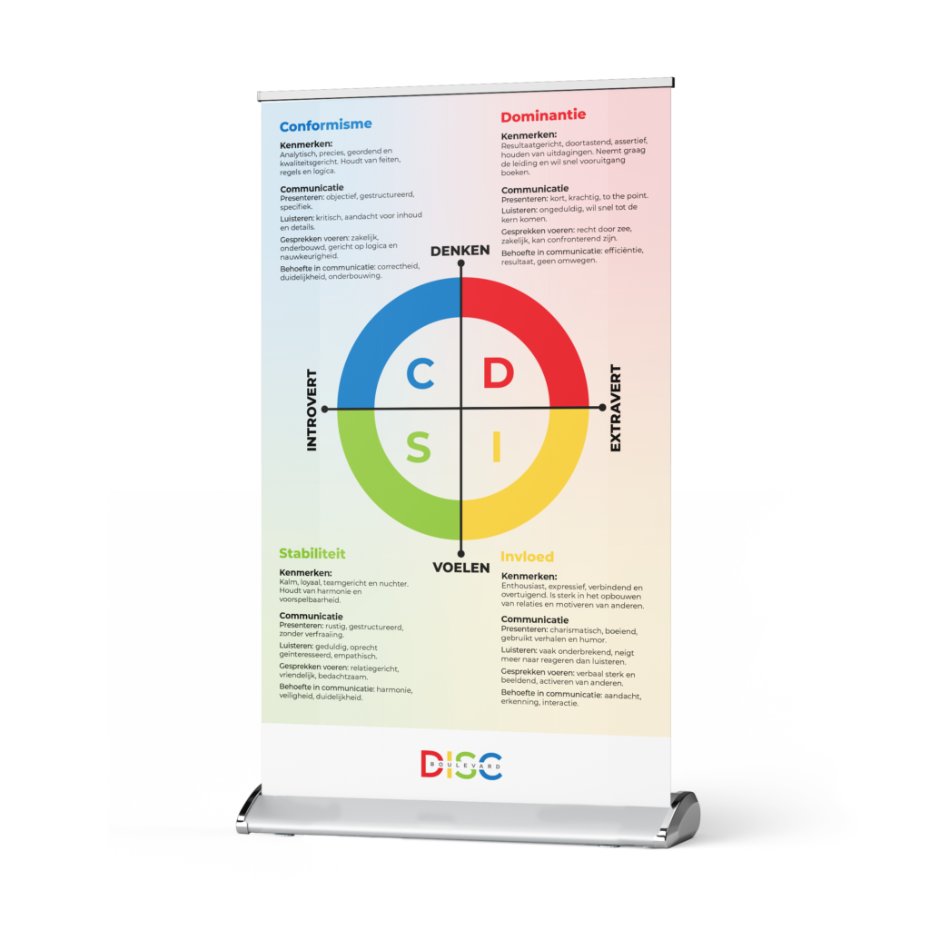 Met de roll-up banner van DISC Boulevard van 2 meter hoog en 1,2 meter breed zie je In één oogopslag zie je alle vier DISC-stijlen overzichtelijk naast elkaar. Perfect als visuele ondersteuning bij trainingen, workshops of in de coachruimte. Zowel in het Nederlands als Engels beschikbaar.
